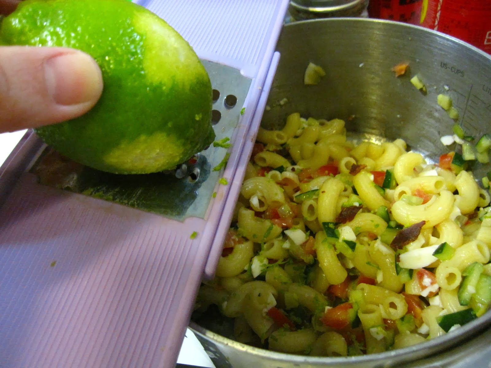 (雞蛋煮全熟的塊狀口感、以及熟透的蛋黃讓通心粉較容易沾附醬汁;若是半熟蛋,則讓整份沙拉入口滑嫩,帶點蛋黃香)