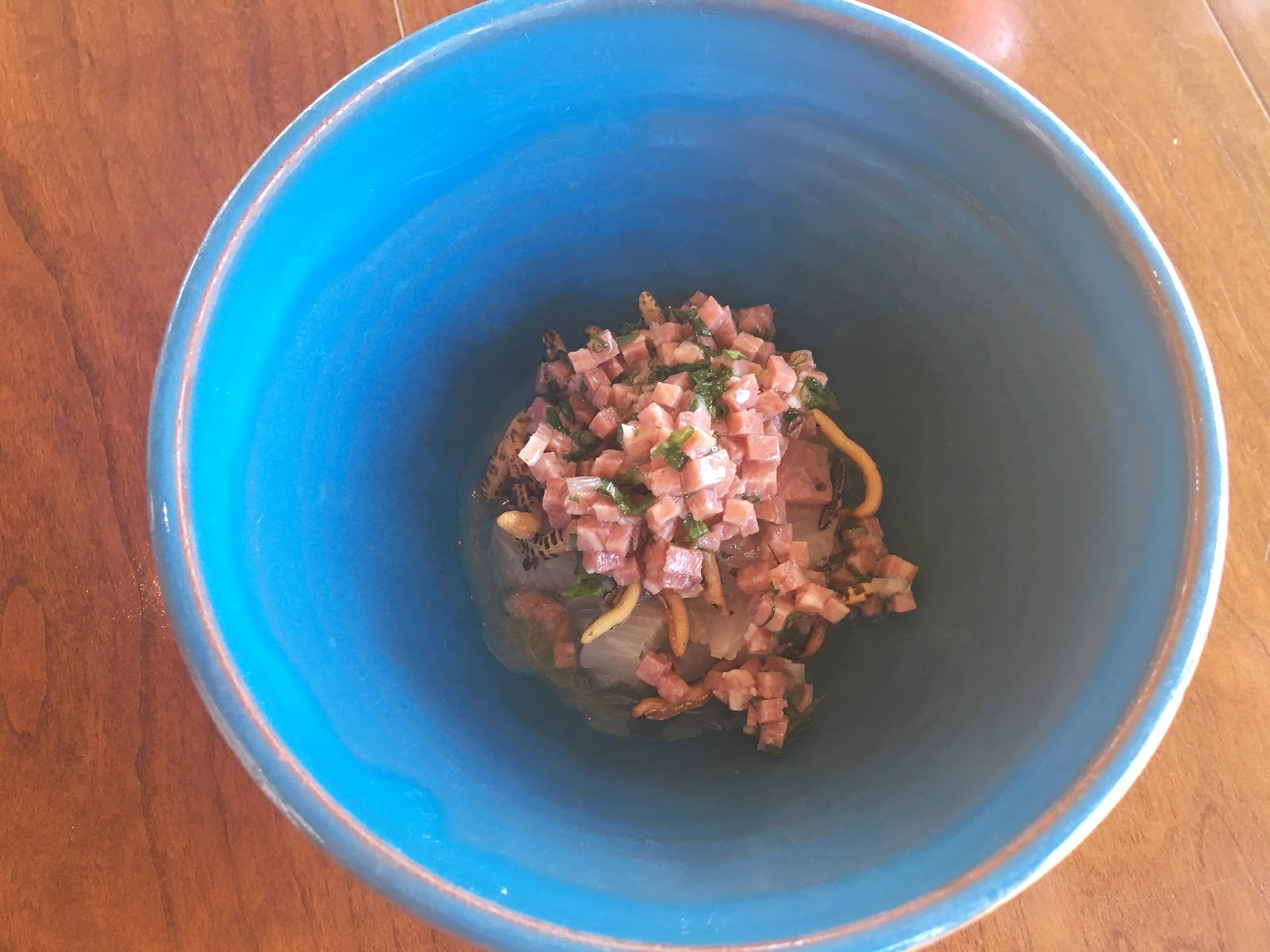 有點巴西式檸檬汁拌生魚的味道,魚肉肉質略為彈牙,酸香的調味與新鮮海味真是美好;原以為香腸有點多此一舉,但那股淡淡的煙燻鹹味又為這道魚肉料理增添不同的香氣;烤過的野生米乍看很像蟲卵嚇我一跳,口感則像烤過的爆米香,酥脆帶軟